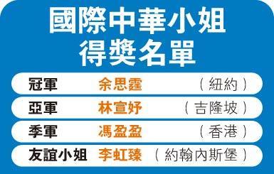 11号纽约佳丽余思霆力压有主场之利的5号吉隆坡佳丽林宣妤及3号港姐冯盈盈,爆冷登上冠军宝座。