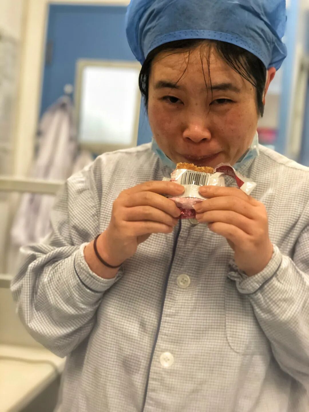 戴佳丽说起与身边其他医护人员以及患者“共患难、战病毒”非常感动:虽然自己穿着防护服时自己不能吃喝,但是看着患者为了与病魔作斗争而坚持吃饭而感到开心。患者病情好转一分,我们就看到多一分的希望。”
