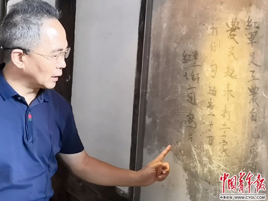 福建省清流县林畲镇毛泽东旧居,清流县革命历史纪念馆馆长刘光军讲解红军标语:“红军是工农自己的军队,农民起来打土豪、分田地,打倒勾结童子军的刀团匪。红军七师一团(宣)”