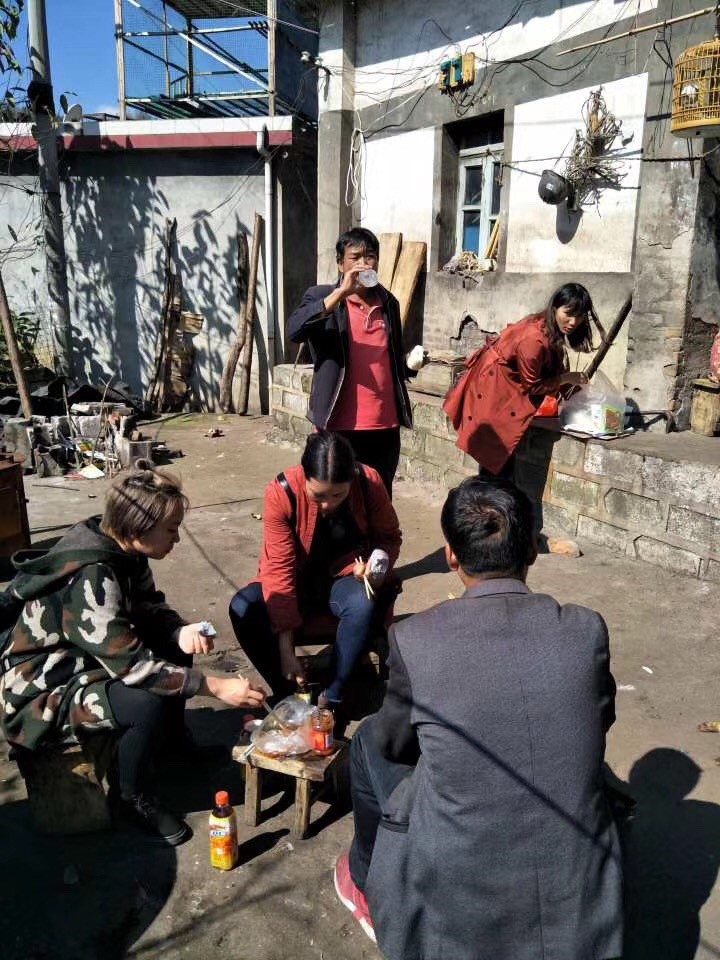 桑姝蓉(左一)带着村干部入户调查,简单吃一点工作餐