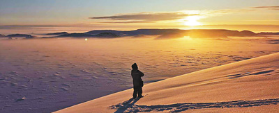 5月3日,队员在内拉湾海冰观测途中看到正午的太阳。 孙晓宇摄