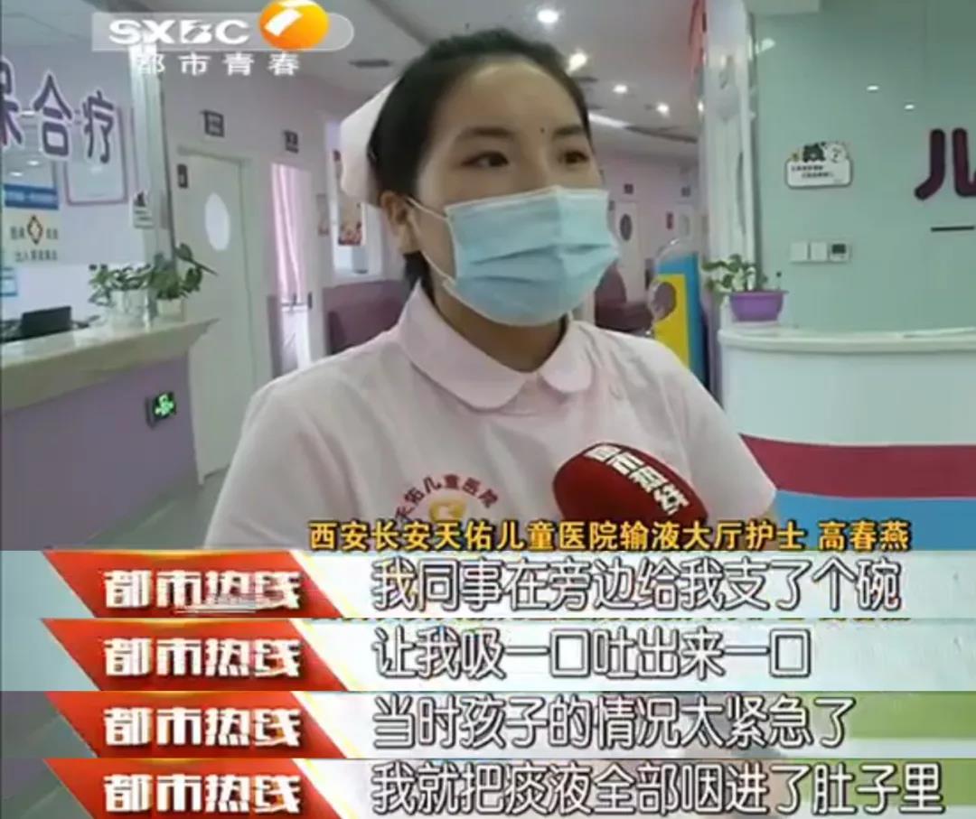 刚来到人间十天的小婴儿危在旦夕,急救中,西安90后护士高春燕拿着吸痰管用嘴给婴儿吸痰,为抢时间急救,她直接吞下婴儿呼吸道中的吸出物……