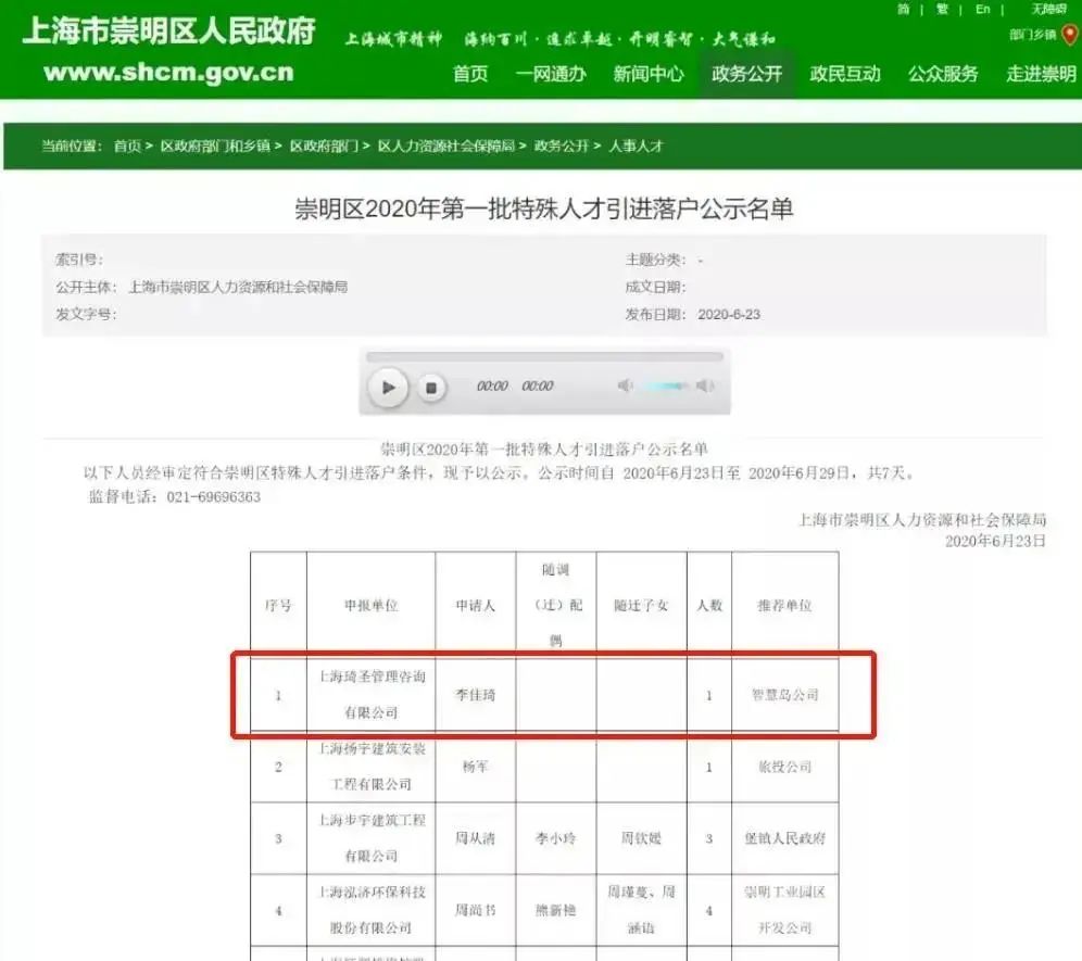 上海市崇明区人社局日前发布崇明区2020年第一批特殊人才引进落户公示名单,李佳琦在列,申报单位为李佳琦担任大股东的公司。