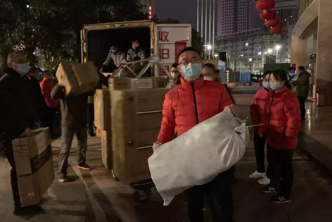 2月13日出发那天一切非常仓促,夜里两点钟接到信息,潘寅兵立即起身准备行李, 四五点钟才把东西收拾完毕。第二天上午的专家门诊按时上完,12点钟就带着行李和大部队一起在新大楼二楼大平台集合,208人的医疗队在医院领导声声叮嘱和科室同仁们无尽关心中浩浩荡荡出发了。飞机傍晚到达武汉,等把大批大批的行李和物资搬运完,所有安顿下来已经是2月14号深夜两点了。